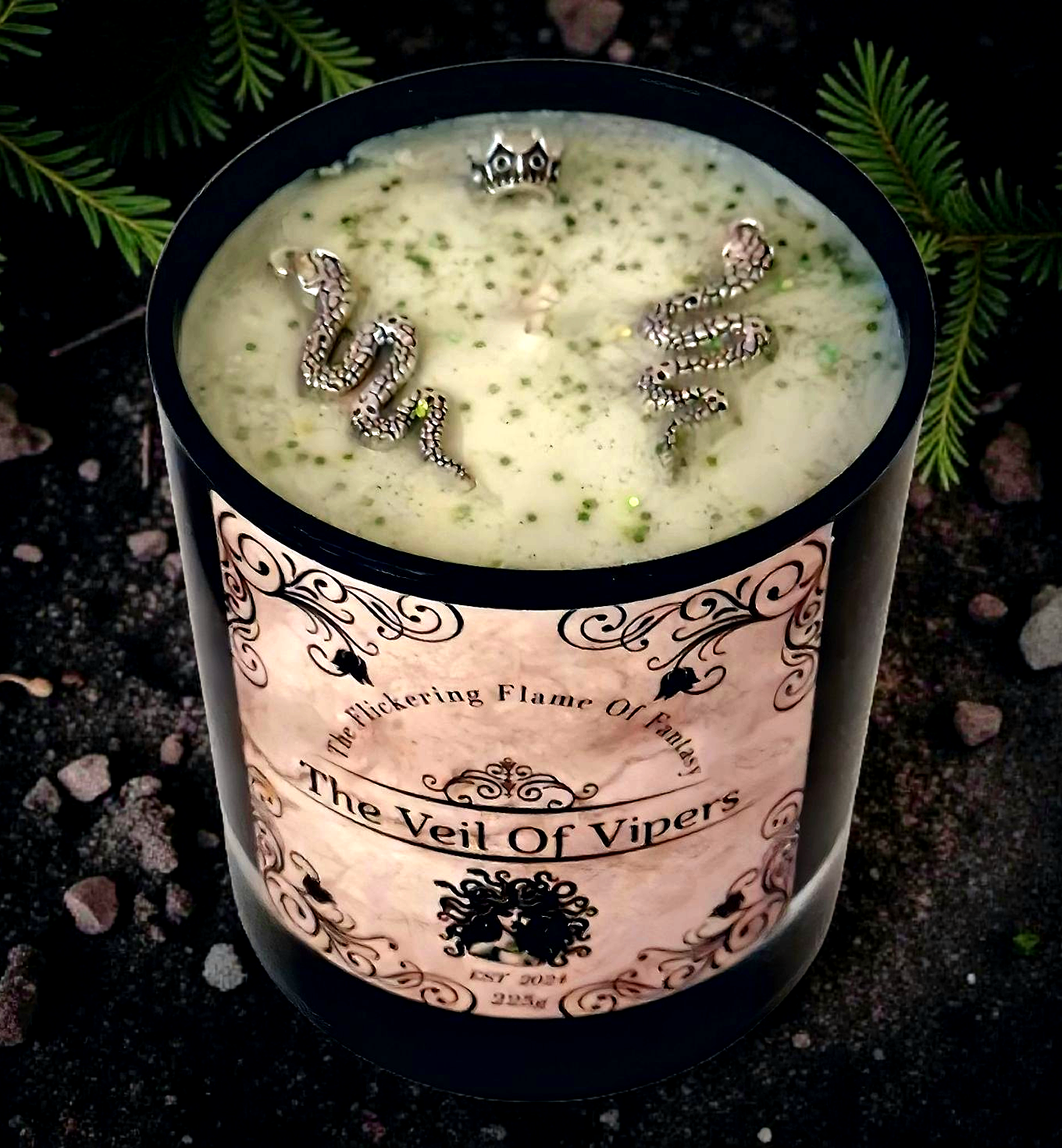 The top of the candle is crowned with symbolic serpent charms, glimmering crystals, and eco-friendly glitter—a reflection of her hidden might and sacred glamour.