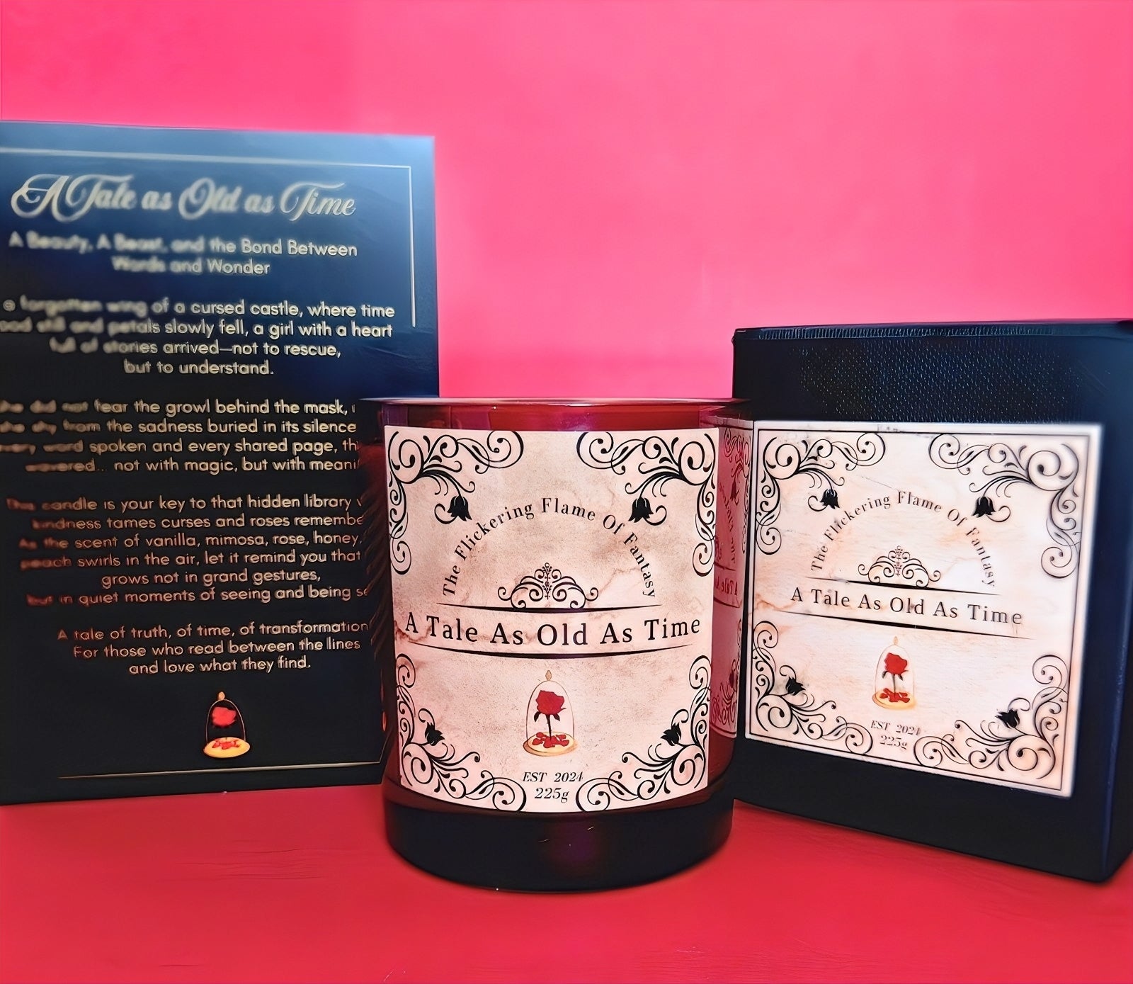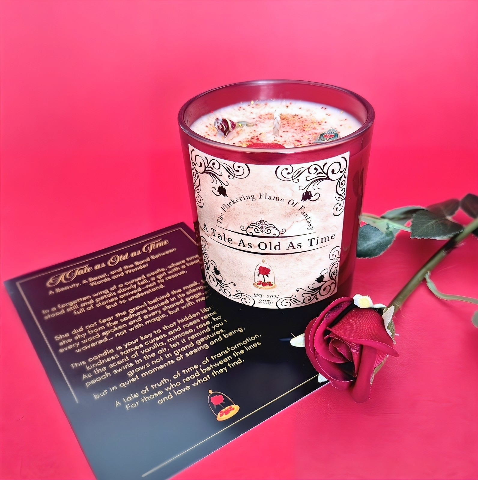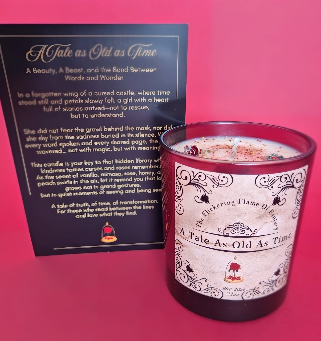 Step into the heart of the enchanted castle with Tale as Old as Time a candle that captures the gentle strength, curiosity, and quiet magic of Belle herself. This elegant blend is infused with sweet vanilla and wrapped in notes of golden mimosa, wild rose, warm honey, and soft peach. It’s a fragrance that feels like a timeless story whispered between pages, a dance of intellect and heart that is both comforting and radiant, just like Belle herself .